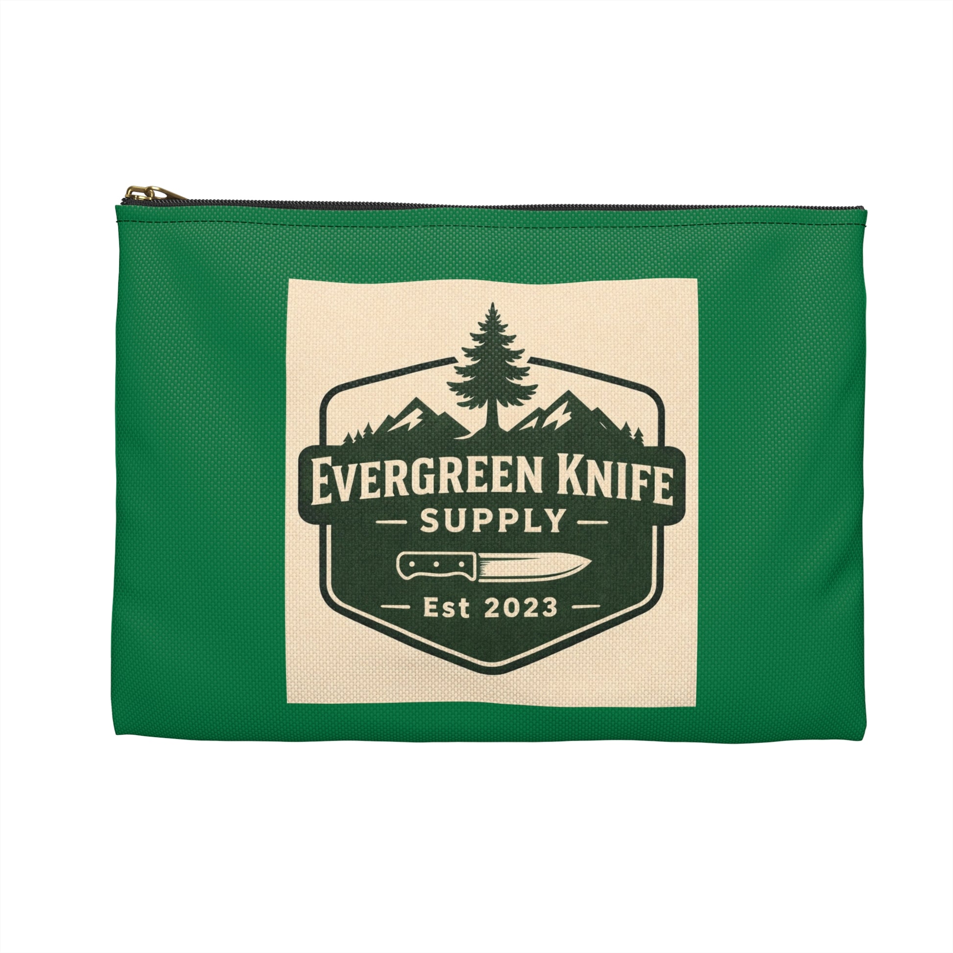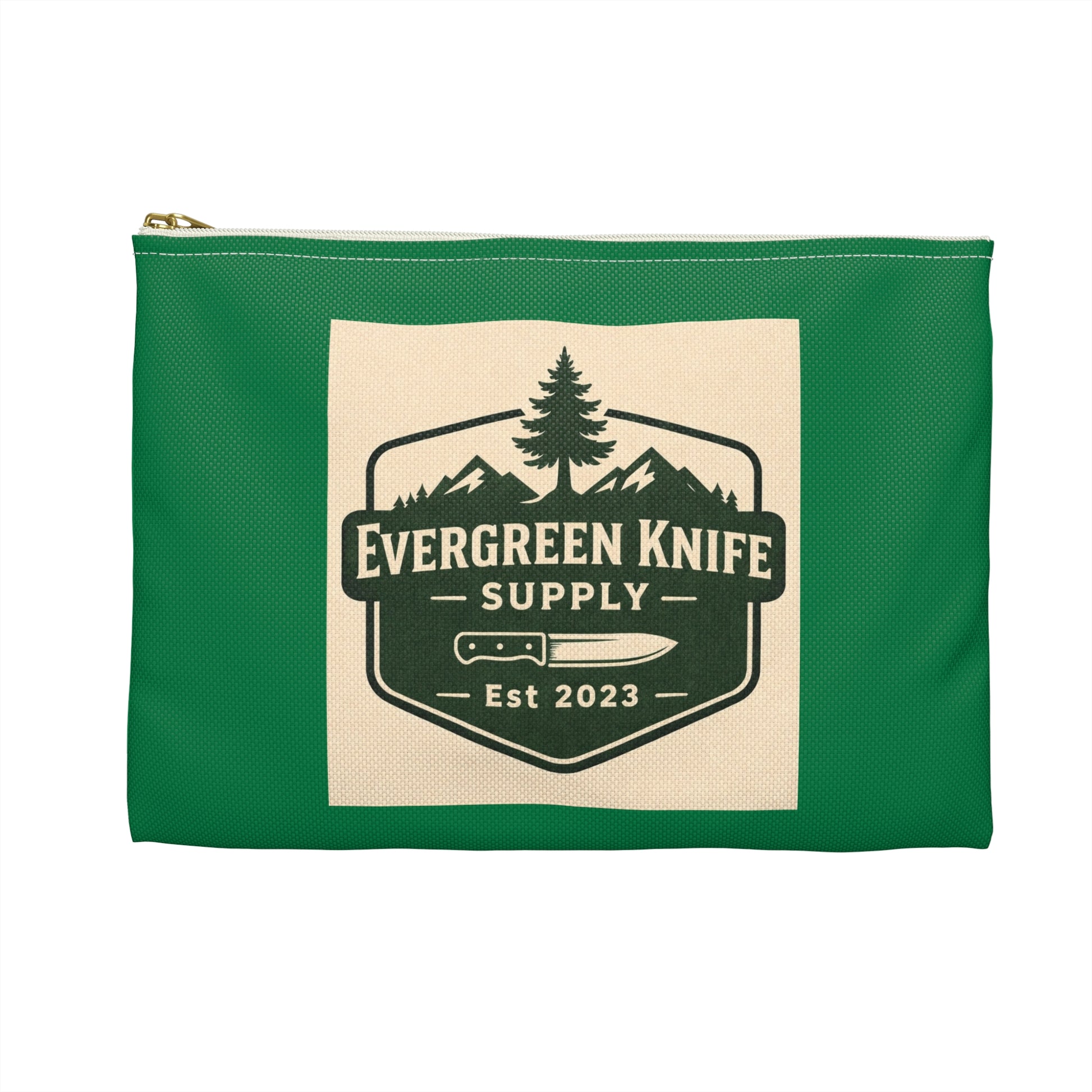 A sturdy, carry-anywhere accessory pouch inspired by backwoods gear and outdoor craftsmanship. The durable spun-polyester shell holds its shape and resists wrinkles, while a crisp, nature-themed patch design—Evergreen Knife Supply with mountain and tree motifs—gives it a rugged, purposeful look. The gold zipper pull and optional black or white laminated lining add a touch of quality and protection for small tools, cords, or everyday essentials. Lightweight and built to travel from trailhead to workshop, this pouch keeps gear organized without fuss.