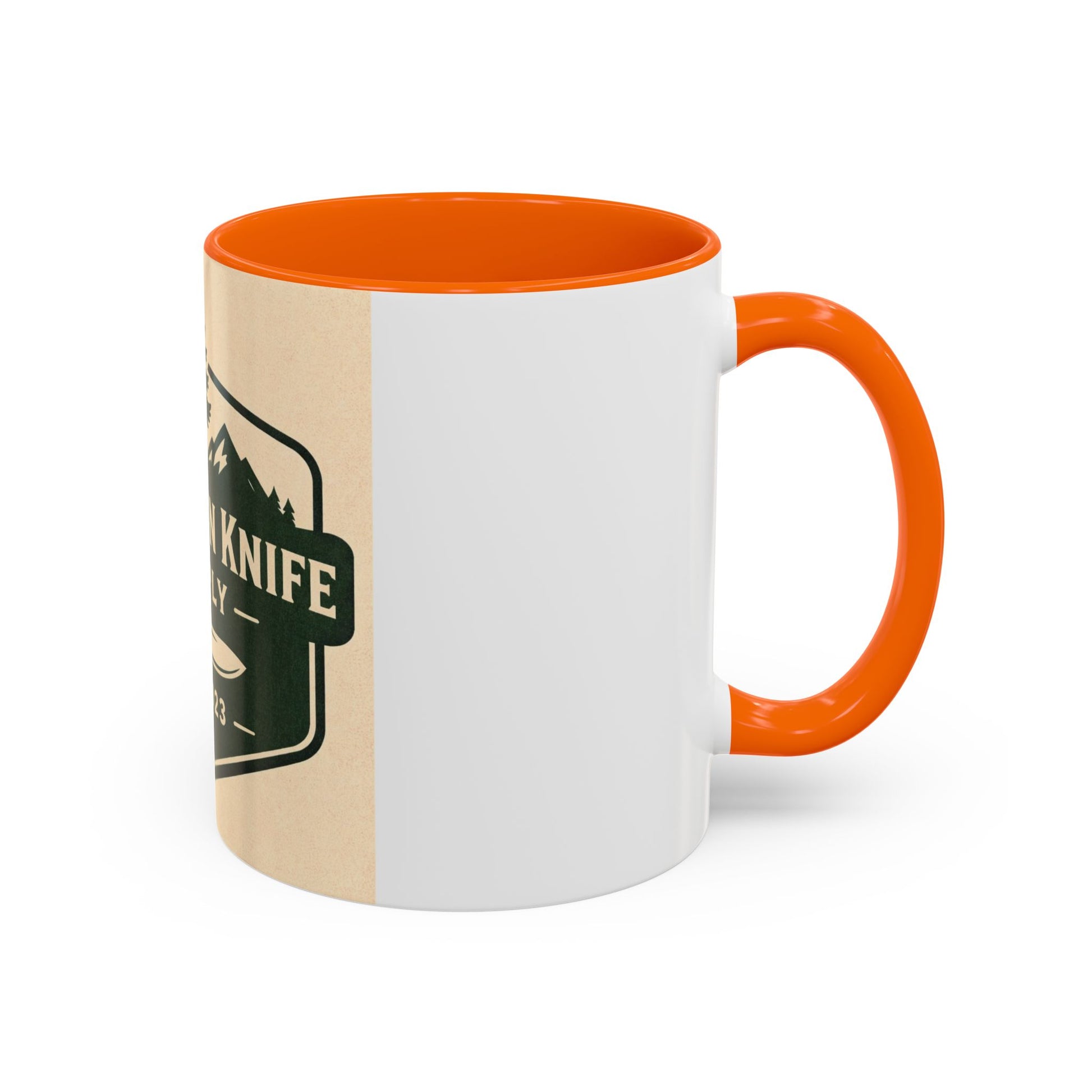 Morning light through pines. This ceramic mug brings that calm, outdoorsy feeling to your kitchen table or work desk. A deep-contrast logo with forest green and warm cream wraps the cup, featuring a vintage badge, a single evergreen, and a robust chef’s/field knife—subtle details for anyone who loves blades, camping, or handcrafted gear. The colored interior and handle add a bold pop with a glossy finish that makes every coffee ritual feel intentional. Use it at home, at the bench while maintaining tools, or tucked into a camper’s fold-out table—this mug holds a steady pour and a quiet reminder of trails and trades.
