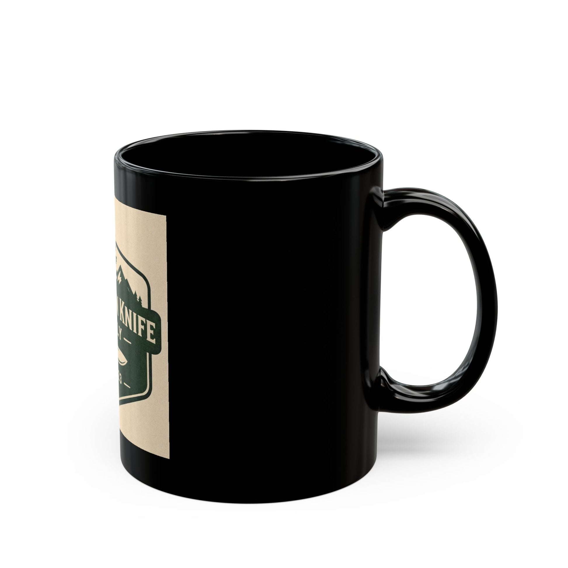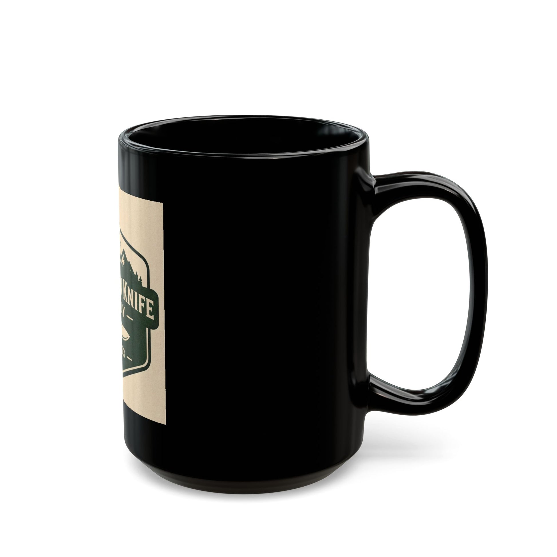 A glossy black ceramic mug that brings a quiet, outdoorsy energy to your morning coffee. The muted tan patch with forest-green badge artwork reads “Evergreen Knife Supply — Est 2023,” framed by a silhouette of evergreen trees and mountain peaks. The sturdy C-handle and smooth glazed finish make it comfortable to hold and easy to clean. It’s the kind of mug that feels right in a woodshop, on a campsite log, or beside a well-worn workbench—comforting, utilitarian, and quietly rugged.